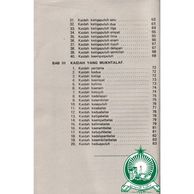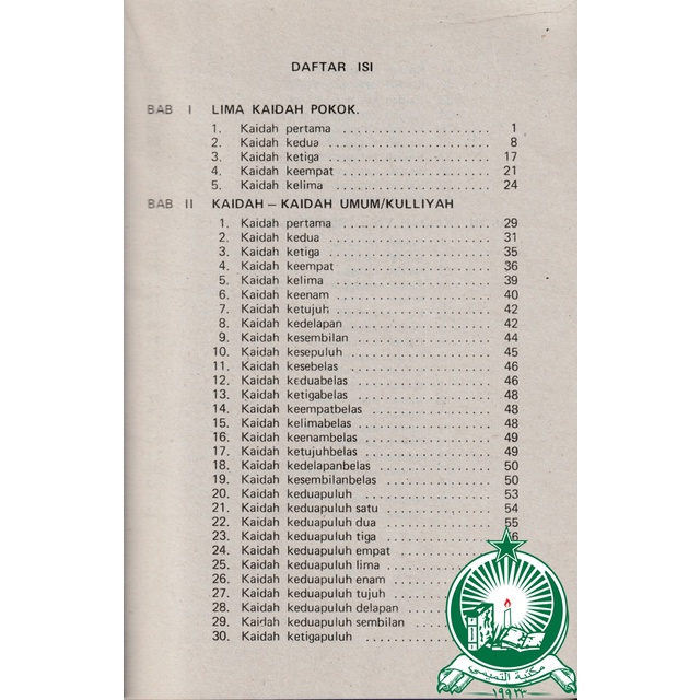 Sesuai dengan susunan Bab dalam “Al-Fara-idul Bahiyyah”, maka buku ini akan terbagi menjadi tiga bab, yakni : Bab I Tentang Kaidah-kaidah Pokok; Bab II Tentang Kaidah-kaidah Kulliyah, yang seluruhnya berjumlah 40 kaidah; dan Bab III Tentang Kaidah-kaidah yang mukhtalaf. Hanya saja, kalau dalam “Al-Fara-idul Bahiyyah” perpindahan masalah tidak begitu kentara, karena dibicarakan secara langsung, maka dalam buku ini, sengaja disisipkan beberapa anak bab disertai dengan judul judul yang sesuai dengan pembicaraan yang ada di bawahnya. Hal ini diharapkan agar lebih memudahkan bagi para pelajar yang baru mulai.