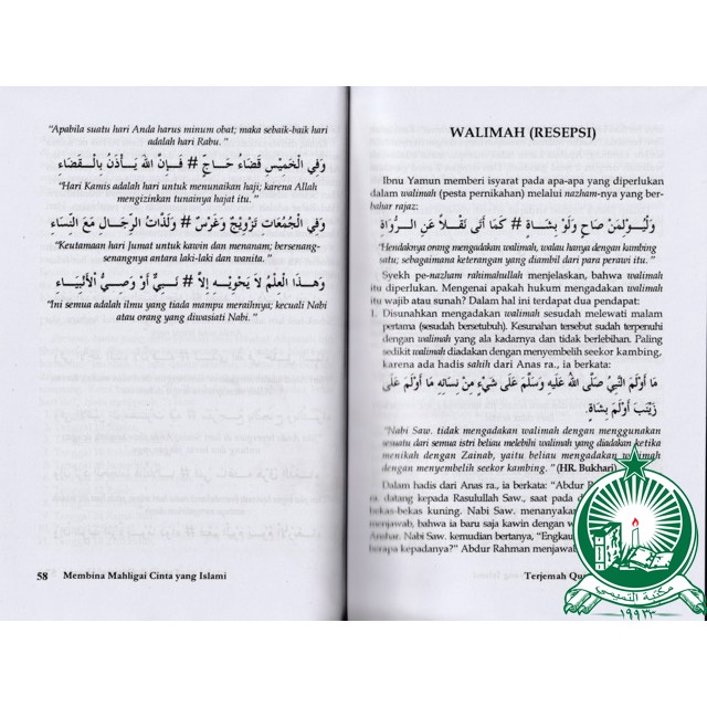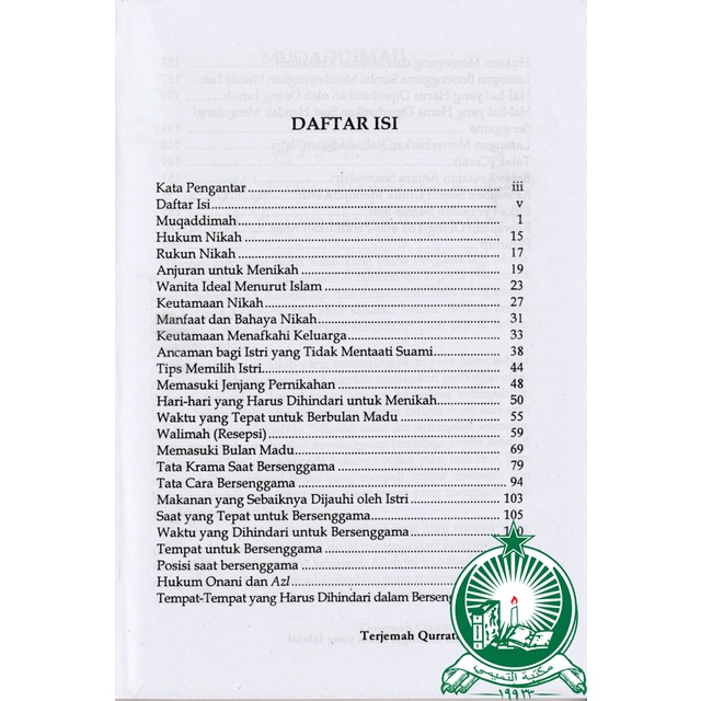 Dalam buku ini memuat secara lengkap hal hal yang berkaitan dengan pernikahan, dari mulai memilih wanita yang akan dijadikan seorang isteri, cara dan etika berbulan madu dan hal yang berkaitan dengan pendidikan anak hasil perkawinan. Tentunya semua ini belandaskan pada syariat yang telah diajarkan oleh Rasulullah SAW. Salah satu kitab yang menerangkan masalah pernikahan adalah ” QURATUL UYUN SYARAH NAZHOM IBNU YAMUN” , karangan Muhammad At Tihami Ibnul Madani Kanun, yang kini hadir dengan bahasa Indonesia dengan judul “MAHLIGAI CINTA YANG ISLAMI”, hingga buku ini tidak hanya dapat dipahami dikalangan santri, tapi juga masyarakat awam yang tidak bisa berbahasa arab.